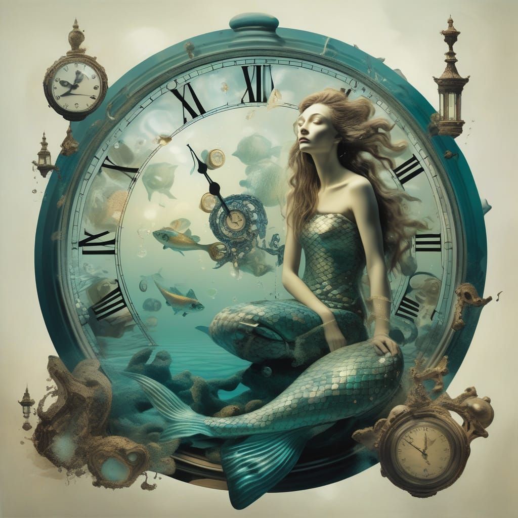 This image depicts a surreal mermaid with distorted features and melting clocks in a fantastical underwater setting, inspired by Dali's dreamlike style.