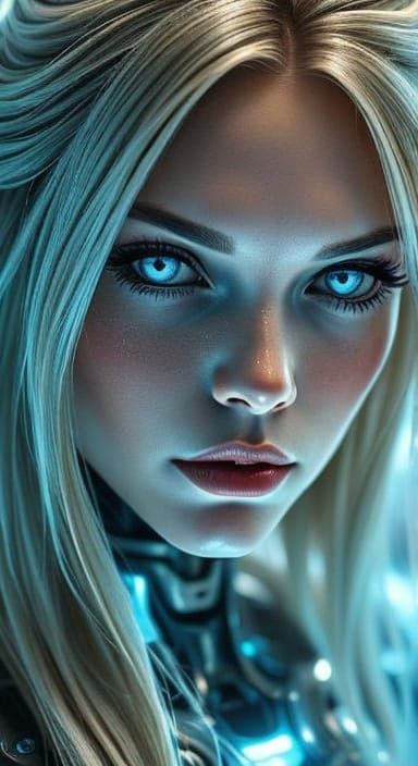 A striking picture of a cyborg woman with bright blue eyes and long hair. The image is hyper-realistic digital art, showcasing visible metal implants and advanced robotic technology.