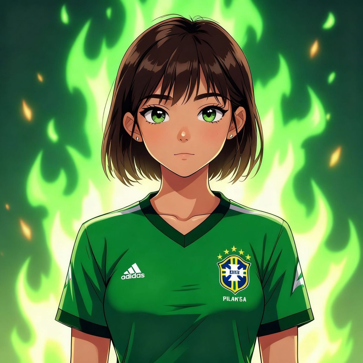 This image shows a determined 16-year-old Brazilian girl in a green soccer jersey, with short dark hair, against a backdrop of intense neon green flames. Created in a dynamic anime style.
