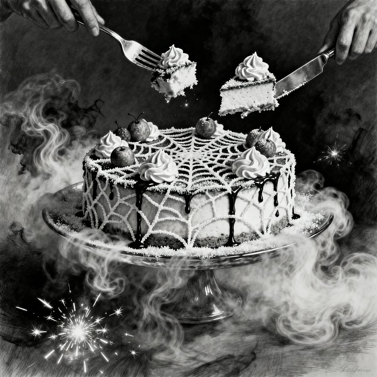 This image showcases a hyperrealistic charcoal drawing of a majestic dessert, resembling cheesecake, constructed from sugared spiderwebs and fruit. It features mystical fog and dramatic lighting, with a fork gently taking pieces.