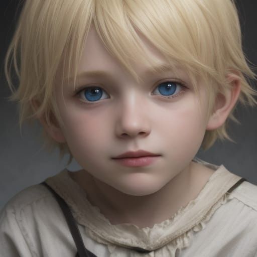 A close-up image of a blond-haired boy with piercing blue eyes. The artwork blends dark, abstract elements with sinister horror themes in a vintage style.