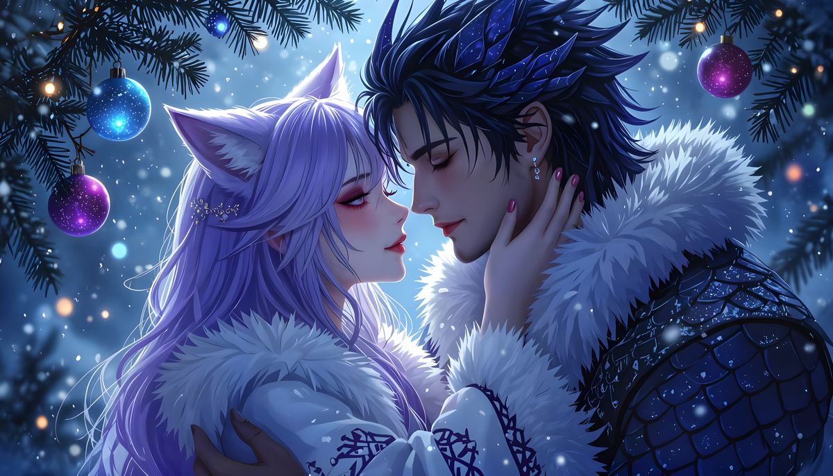 This detailed oil painting captures a romantic winter scene. A lavender-haired kitsune in a gothic kimono is held by her half-dragon lover in a fur-trimmed jacket, with bioluminescent garland and snow creating an elegant atmosphere.