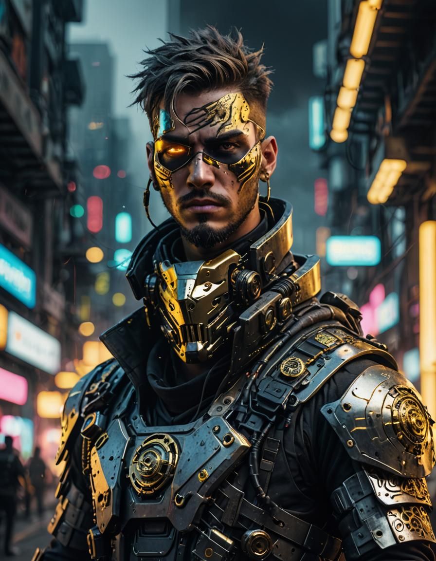 A low-angle shot of a scarred cyborg pirate in a grey sci-fi uniform. The image features neon glitch effects, polished metal, and golden hour lighting in a dark, cinematic cyberpunk aesthetic.
