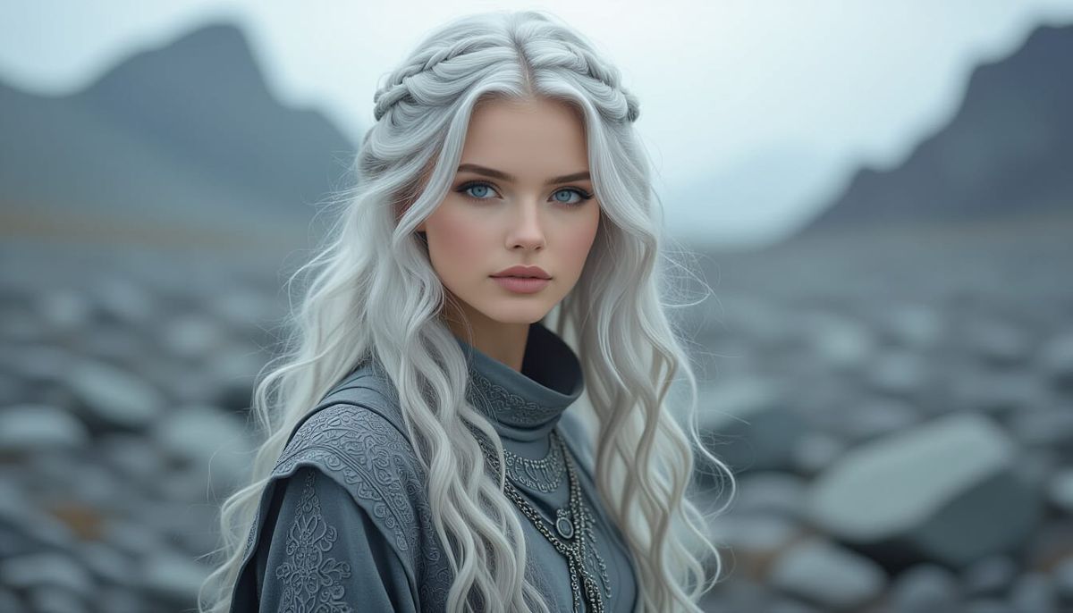 This image features a woman with long, curly gray hair and intricate gray clothing in a natural setting of gray rocks. Rendered in a detailed, surreal style with a monochromatic gray palette and soft lighting.