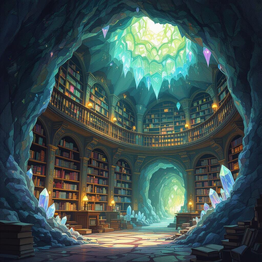 This image shows a majestic library inside a giant geode, filled with glowing books and crystal light. It's a fantasy concept art piece in the style of Studio Ghibli.