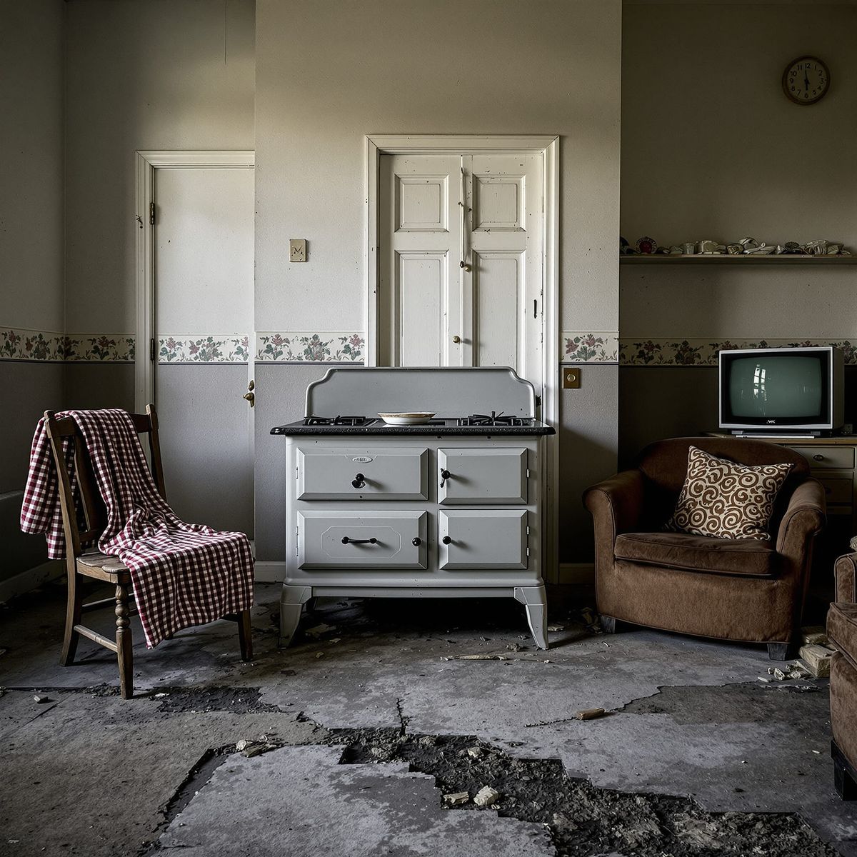This image depicts a decaying room centered around a vintage light gray cast iron wood stove. It captures a scene of neglect with muted colors and dramatic shadows, reminiscent of urban decay photography.