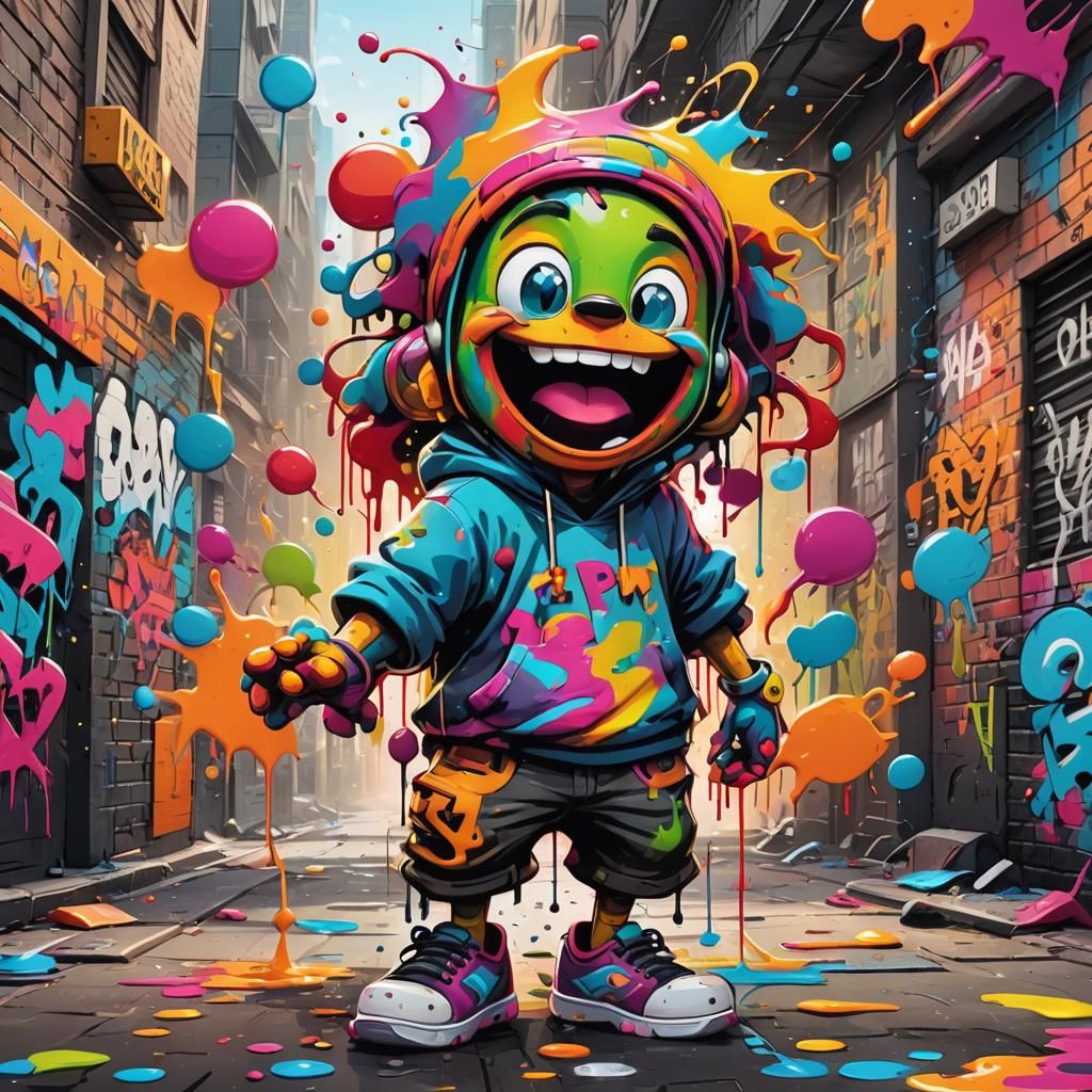 This image shows a joyful cartoon character set against a backdrop of vibrant, cartoony elements. The artwork is rendered in a graffiti art style, with bright, high-contrast colors.