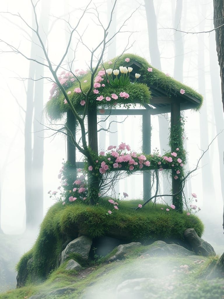This image features a mystical forest scene with a mossy wooden structure covered in vibrant flowers, set against a serene white background and shrouded in soft fog. Watercolor textures blend with precise drawings, evoking intricate details in a surreal dreamscape with high-contrast colors and subtle HDR...