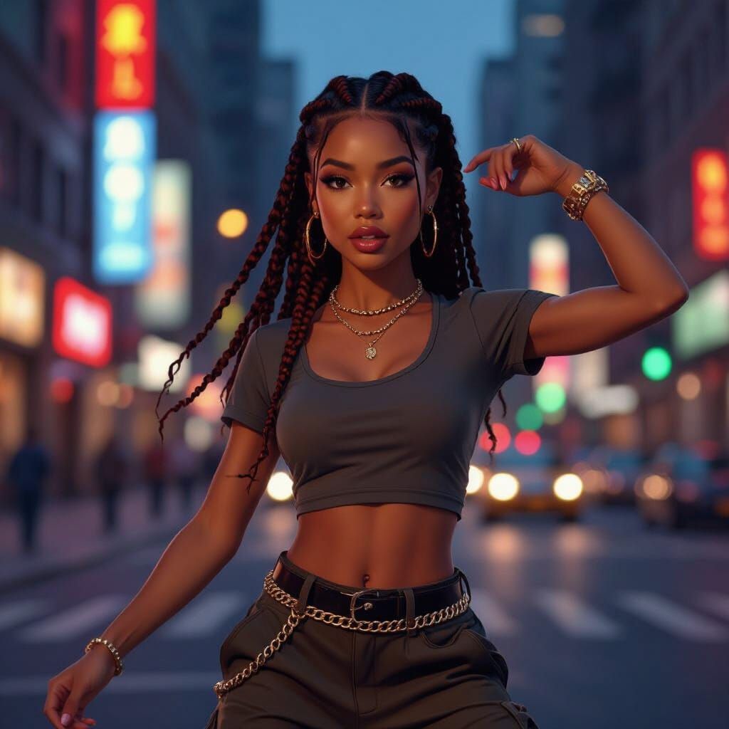 This dynamic digital painting captures a stylish brown-skinned female hip hop dancer performing on a city street at dusk. Vibrant lights and atmospheric lighting highlight her energetic movement.