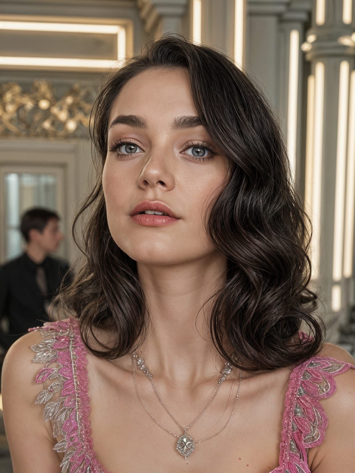 This image shows a beautiful brunette woman wearing a stunning long white night gown in a dramatic 1930s style, set against a colorful background with intricate details and rich color depth.
