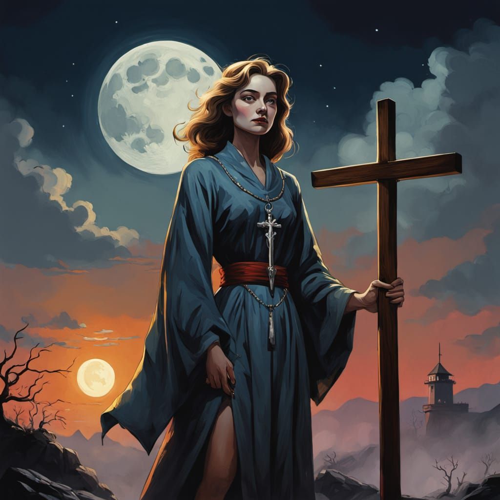 This image shows a brave woman silhouetted against a moonlit sky, holding a wooden stake and crucifix. Rendered with bold brushstrokes, high contrast and vivid colors in a vintage manga-inspired style.