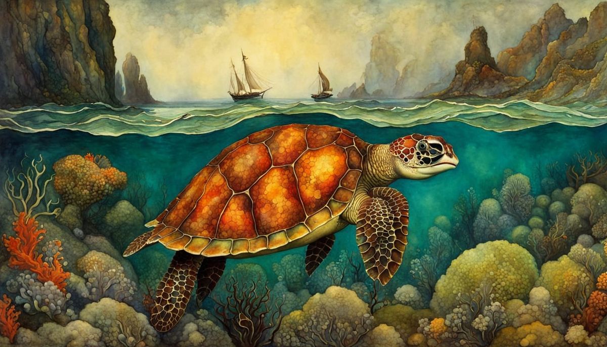 This image shows a vibrant underwater scene with seahorses and a sea turtle amidst a coral reef. The artwork has a surreal and artistic aesthetic with deep focus, rendered in watercolor and charcoal.