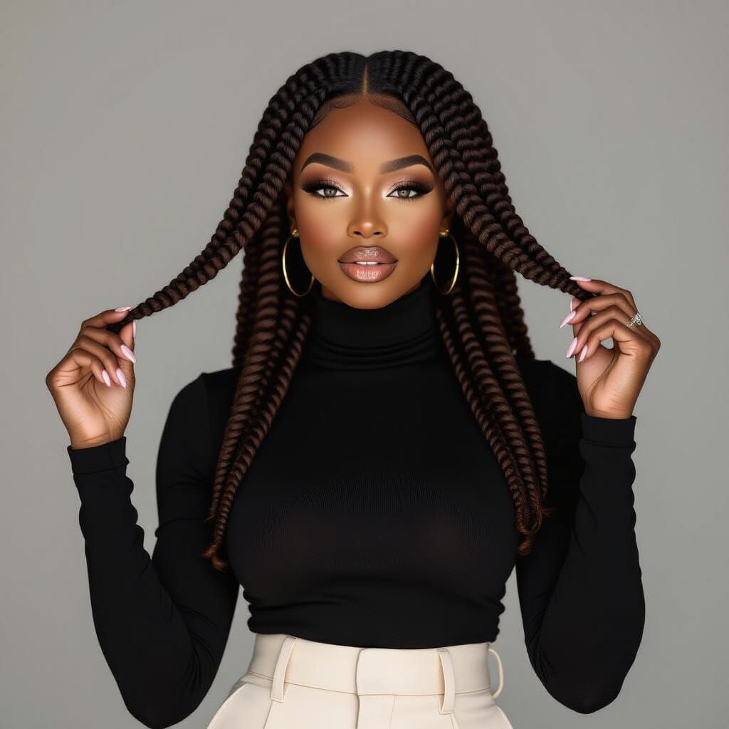 A Black woman influencer with glowing makeup and stylish twists, wearing a black turtleneck and cream pants. Captured in a modern studio with cinematic lighting.