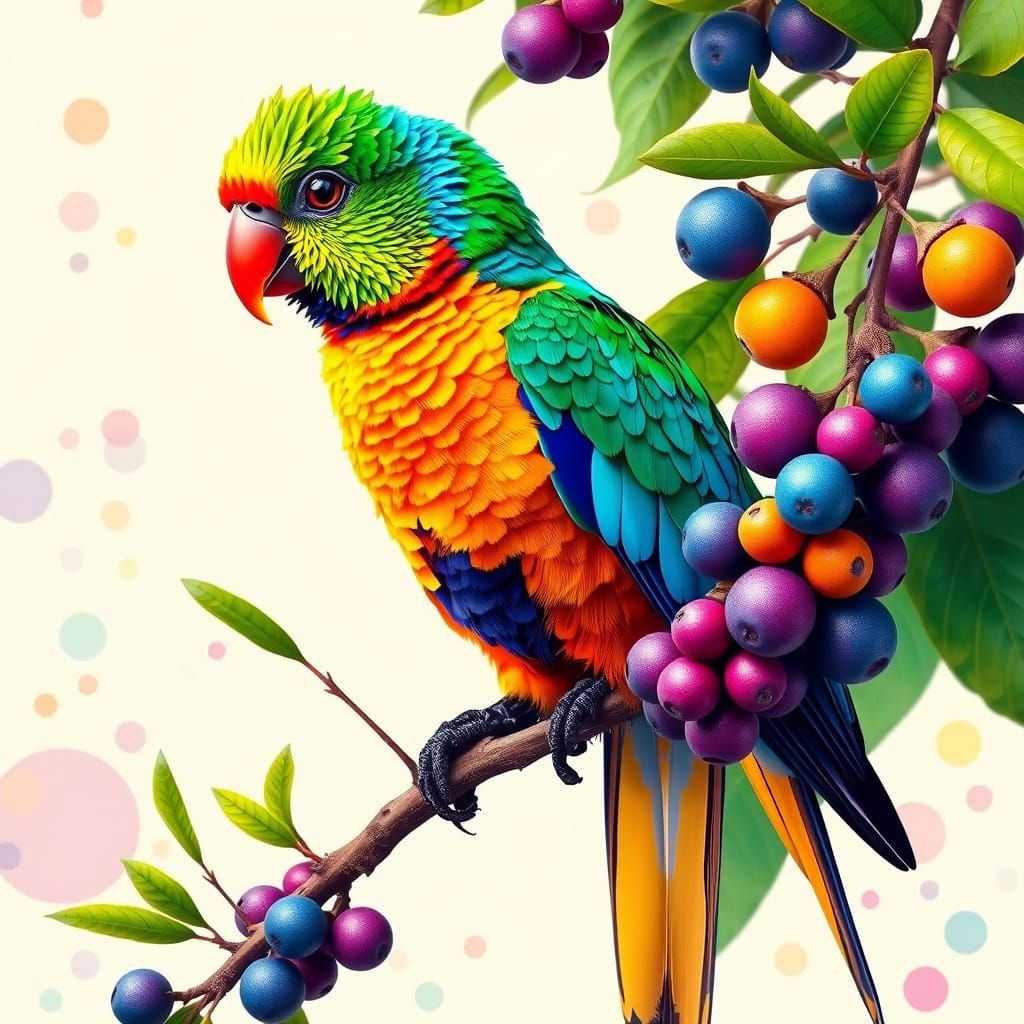 A vividly plumed tropical bird rests on an entangled branch, its feathers shimmering in gradients of green, blue, orange, and red. Surrounded by lush foliage and jewel-toned fruit, the scene blends natural detail with abstract circular patterns against a soft cream backdrop, evoking a whimsical tropical dreamscape.