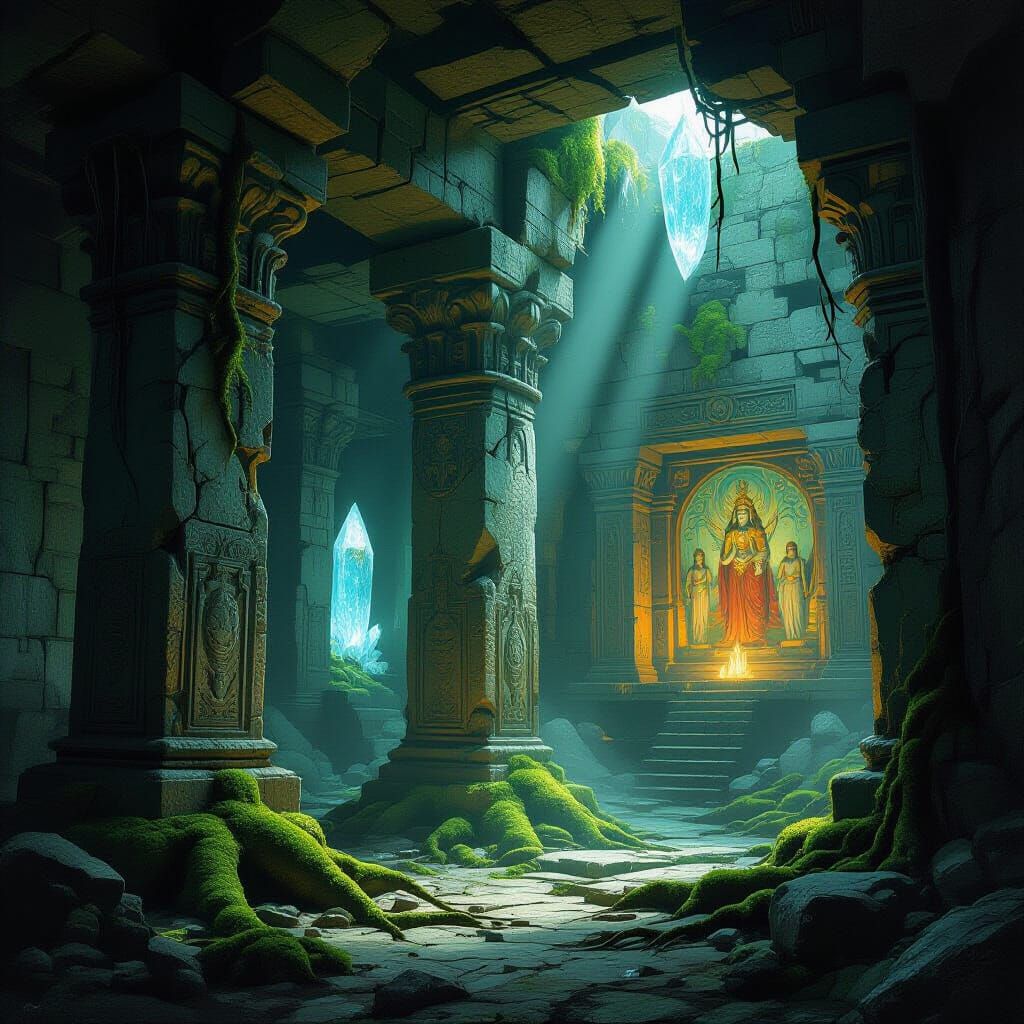 A striking picture of a ruined temple deep underground, with glowing crystals lighting up murals. Stone pillars and roots create a mystical atmosphere in a digital painting style.