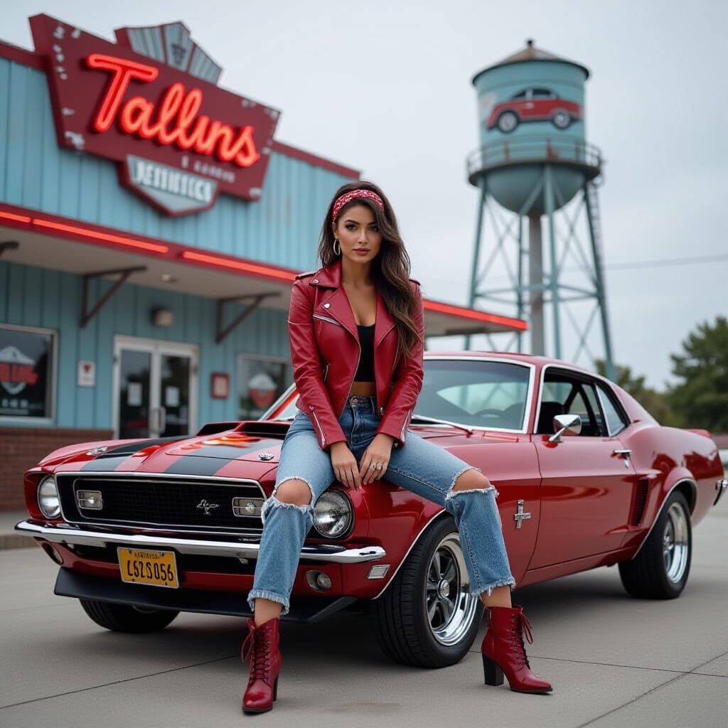 This image captures a confident woman in a leather jacket on a metallic red vintage muscle car. Features a nostalgic Americana aesthetic with retro buildings and neon lights.