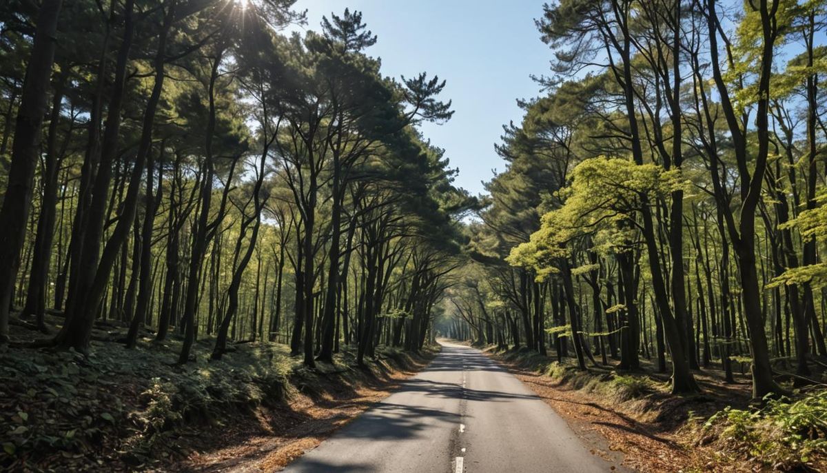 This image shows a winding cobblestone road through a dense forest, illuminated by dappled sunlight. In the distance, the calm sea shimmers through silhouetted trees, reminiscent of romantic landscape paintings.