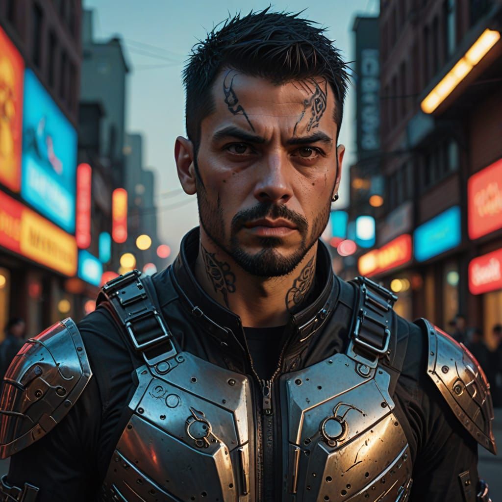A cinematic portrait of a rugged, technologically-enhanced assassin, set against a dramatic backdrop of warm light and deep shadows, with intricate details and a muted color palette.