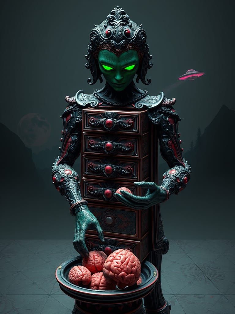 This haunting image shows a mystical guardian crafted from intricately carved drawers, with rich colors and contrasting hues, blending abstract patterns and ink drawing techniques in a dreamlike, whimsical atmosphere.