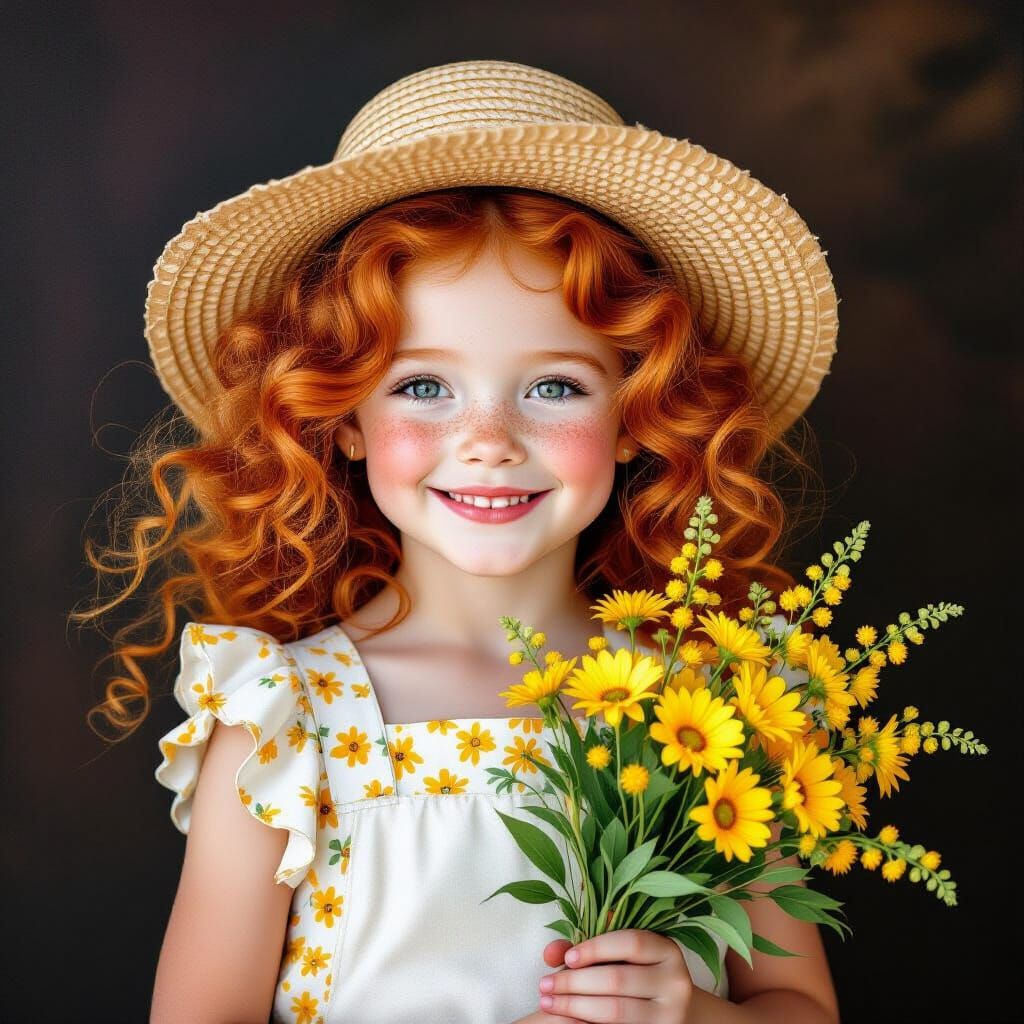 A digital watercolor of a smiling young girl with red curly hair, freckles, and a straw hat, holding a mimosa bouquet. She wears a white dress with yellow flowers and a white apron against a dark textured background.