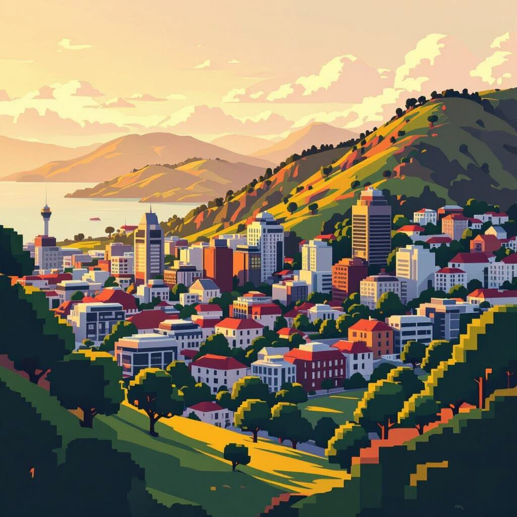 This image shows a pixelated landscape of Wellington with rugged hills and valleys, featuring stylized buildings and cubic trees bathed in dreamy golden light. The artwork has a distinct low-poly aesthetic.