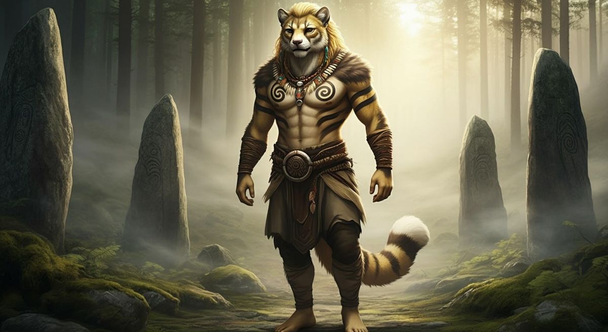 This image shows a muscular, golden-furred Ferasan male in a forest clearing. He wears tribal clothing with swirling clan symbols, evoking indigenous art in earthy tones.