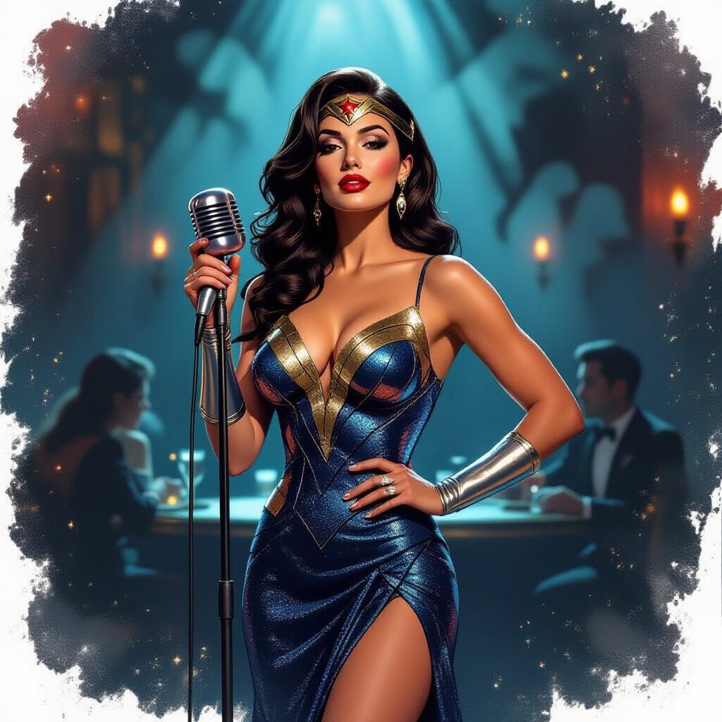 This image shows Wonder Woman performing as a glamorous cabaret singer in a jazz club. The artwork features cinematic lighting and a vintage art deco aesthetic with hyperrealistic rendering.
