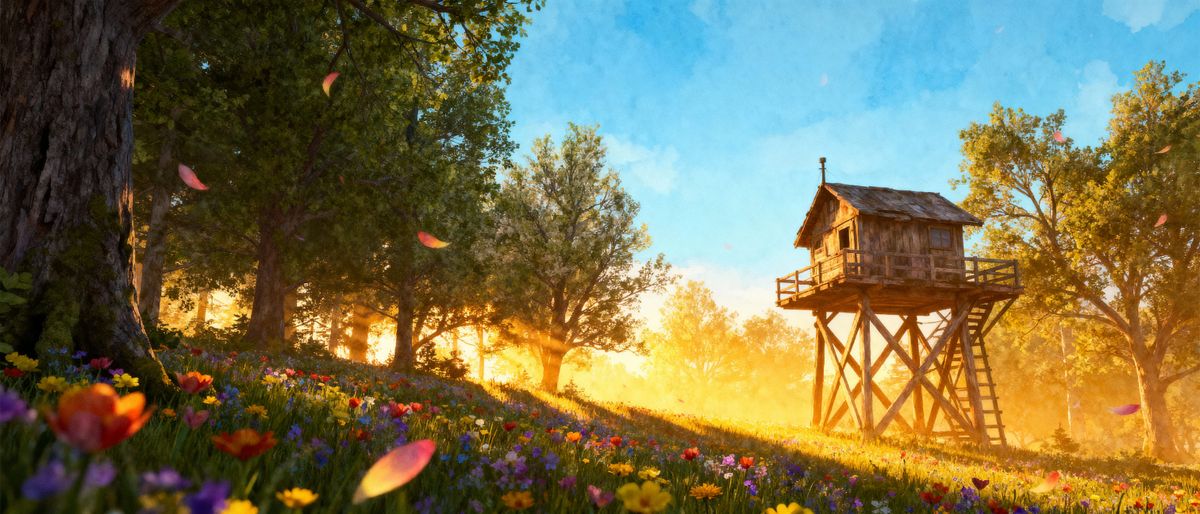 A breathtaking spring landscape rendered in a watercolor style, featuring lush trees, colorful wildflowers, and a wooden cabin bathed in golden sunset light. The scene evokes an ethereal atmosphere.