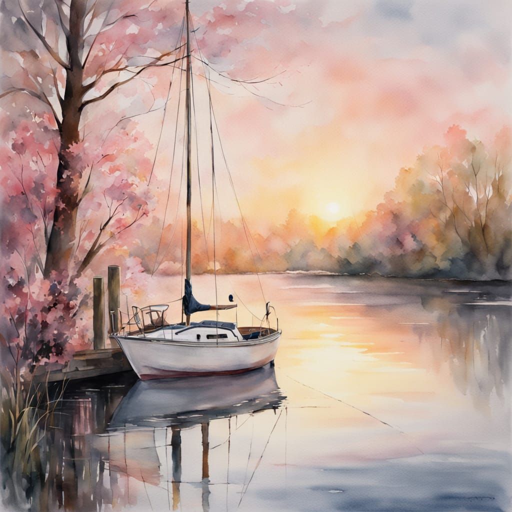 This watercolor painting captures a sailboat by a dock in a tranquil pond during a spring sunrise. Gentle brushstrokes create soft pink and gold hues with delicate textures.