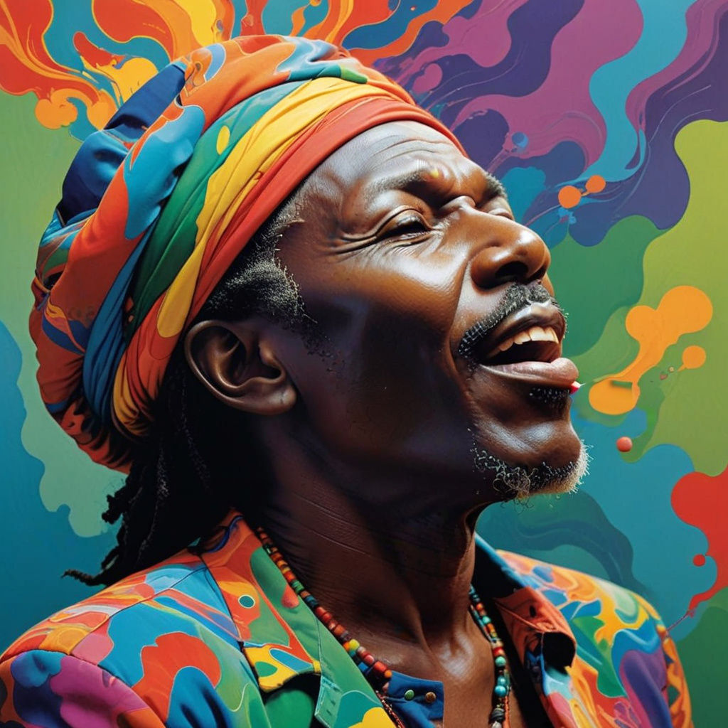 This image shows a surreal double exposure of a famous African musician singing and dancing on stage, merged with the image of a revolutionary leader, set against a vibrant and colorful background, blending the styles of music and politics.