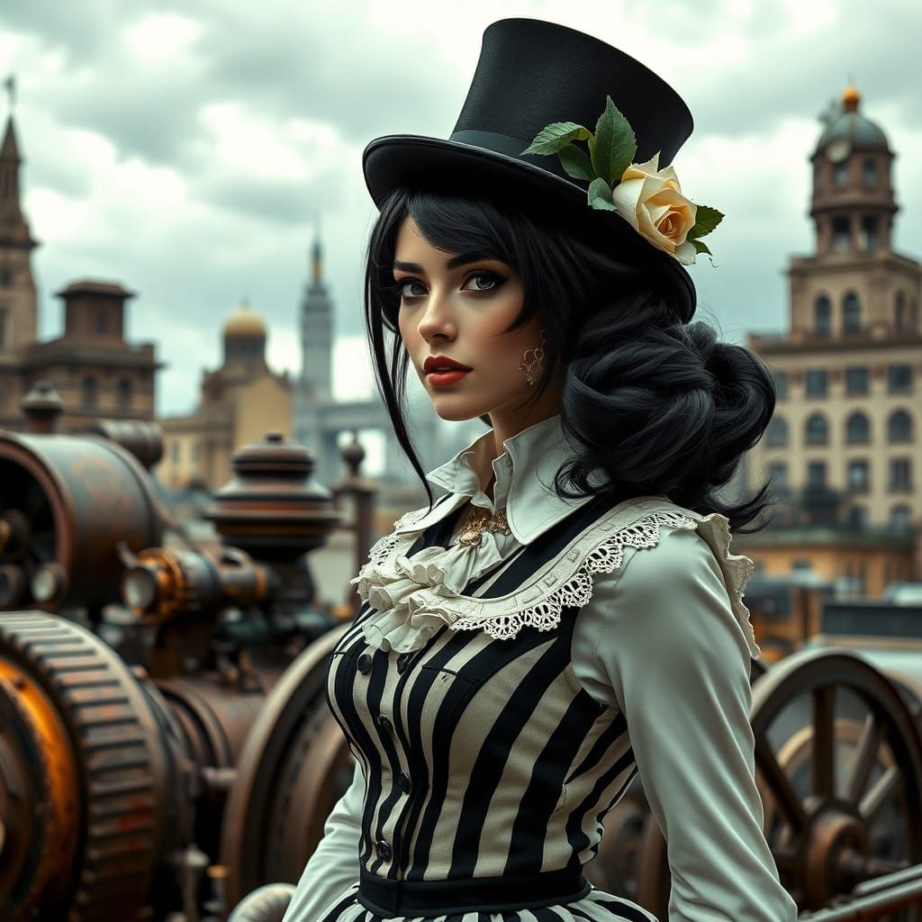 A medium shot of a REALISTIC steam punk woman with a sultrIE expression. She has black hair and wears a black hat with a white rose. She is wearing a black and white striped vest and a white collar. She has a black and white skirt. The background is a city with a cloudy sky.