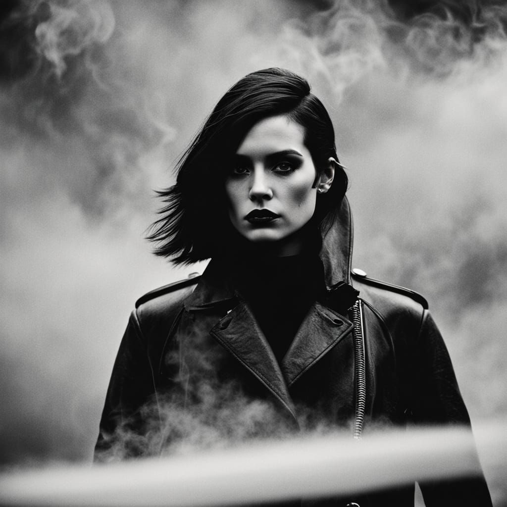 A grainy black and white portrait of a goth fashion model in a leather trench coat, surrounded by smoke and fog. The image evokes a film noir aesthetic with high contrast and dark tones.