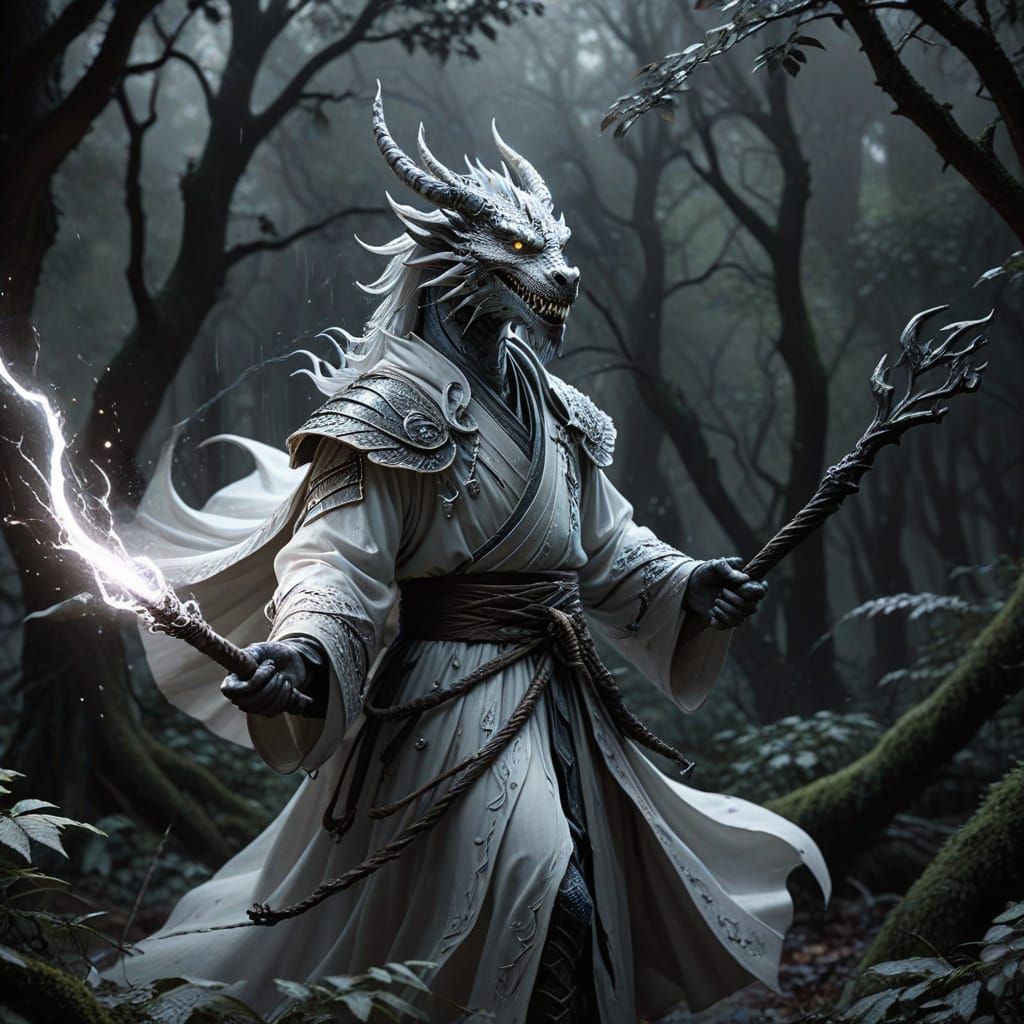 This image shows an anthropomorphic dragon sorcerer dancing in a storm. The dragon wears layered robes and wields a glowing staff, depicted in a black and white pencil sketch with masterful shading.