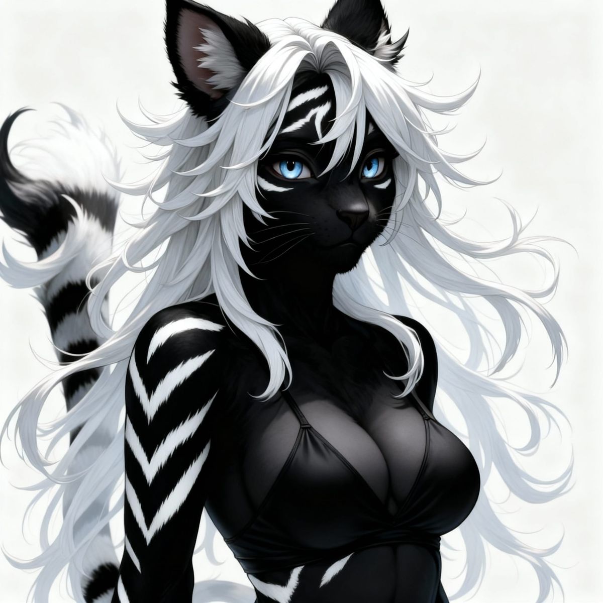 This image features a striking anthropomorphic tiger woman with windswept, dyed hair, depicted in a minimalist bikini. The artwork is rendered in a bold, cel-shaded illustration style with fine details.