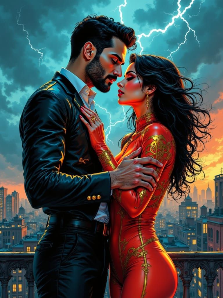 A striking picture of Marvel superheroes Gambit and Rogue in a romantic pose. This illustration combines bold comic linework with hyperrealistic painting to create a dramatic, cinematic scene.