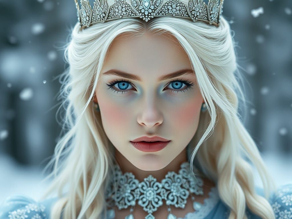 This image shows a beautiful woman with long platinum blonde hair and striking blue eyes, dressed as a winter queen. The fantasy portrait features delicate details and a dulled color palette, set during a snow storm.
