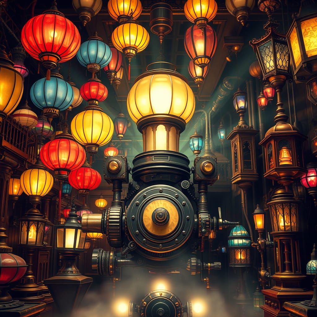 This image shows a steampunk engine surrounded by paper lanterns. Intricate wooden and glass light structures and ornate iron fixtures cast a warm glow with multicolored rays in a steampunk aesthetic.