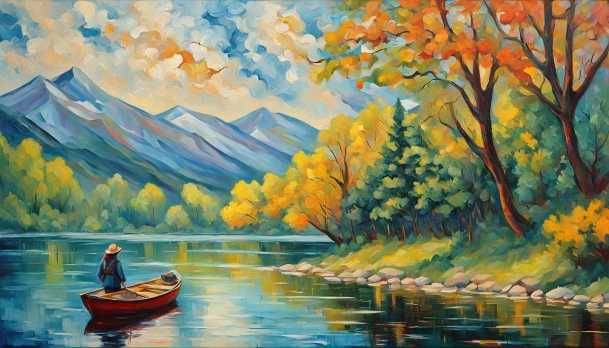 A vibrant neo-impressionist painting of a woman by a misty mountain lake in spring. The colourful oil painting uses thick impasto and layered paint to capture the warm golden light.