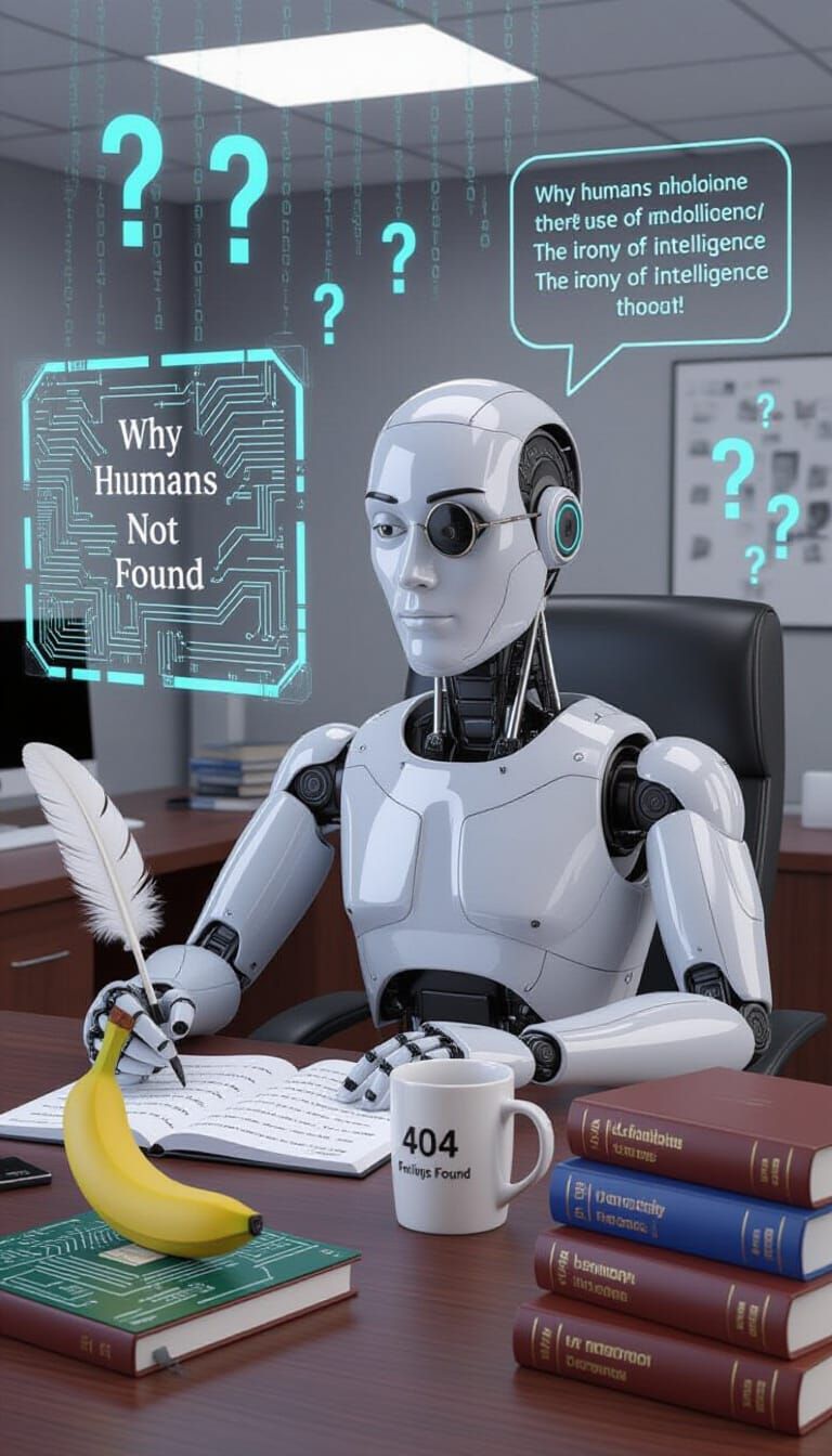 This image shows a humanoid robot sitting at a desk, holding a quill pen and staring into confusion. Above its head float binary code and question marks. A digital display reads “Why Humans Not Found”, while a speech bubble glitches through a broken sentence: “The irony of intelligence thooott!”