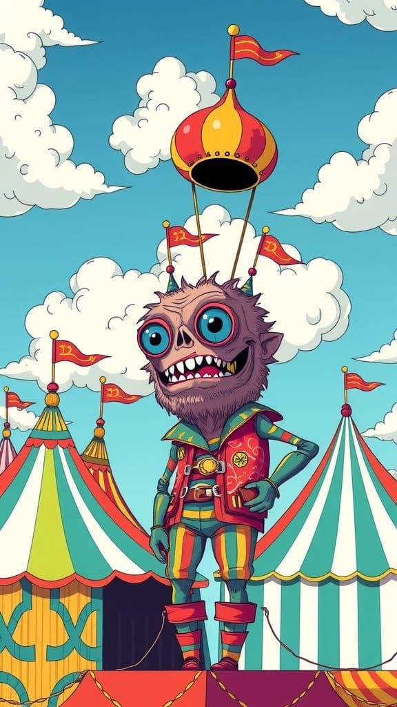 carnival scene with colorful tents, featuring a delightful "ugly" monster wearing vibrant clothing, set against a bright blue sky with fluffy white clouds