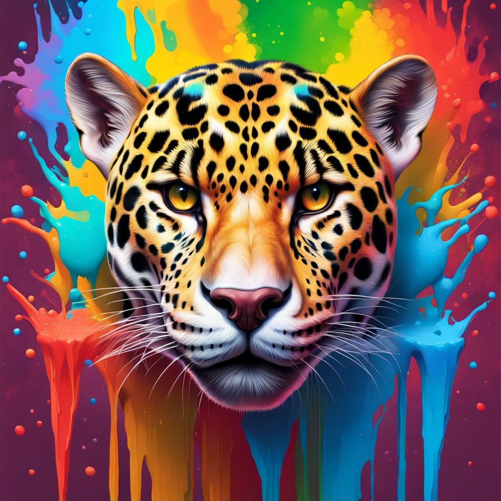 A vibrant, hyperrealistic close-up of a jaguar's head. The image features a splash art style with rainbow colors and lotus elements, set against a colorful background.