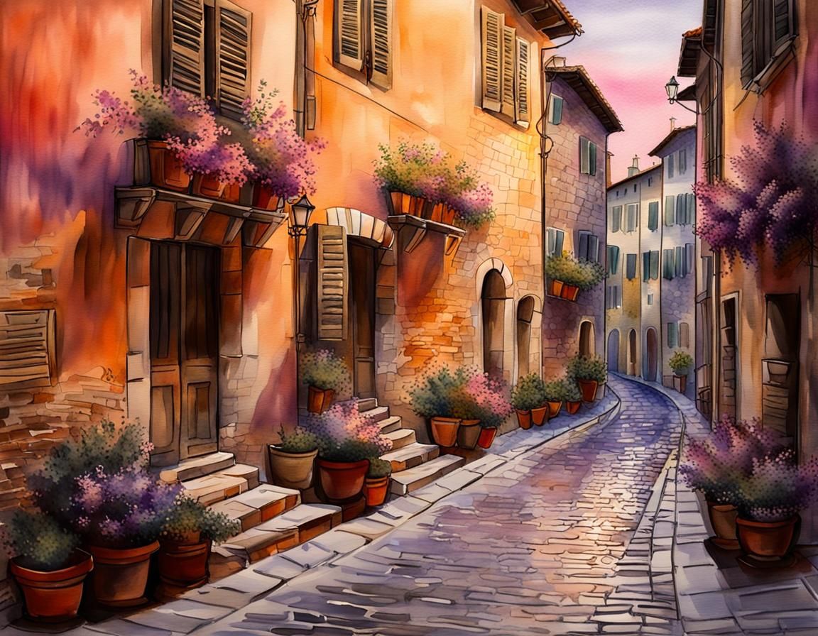 A watercolor of a quiet Tuscan street scene at night. The cobblestone street is lined with weathered buildings, flower boxes and muted light. The image captures a dreamy, nostalgic essence with soft brushstrokes.