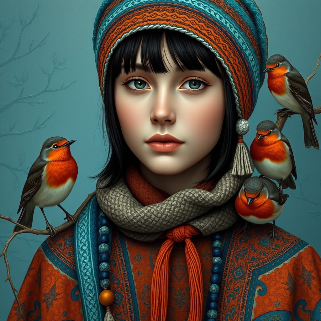 This highly detailed digital illustration features a young Polish woman with dark hair wearing a richly adorned terracotta and blue woven head covering and neck wrap. European robins perch nearby.