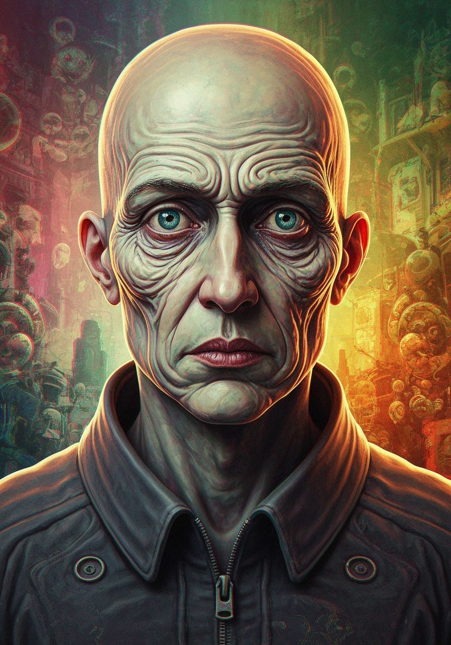 This image depicts a hyperrealistic, multi-dimensional being in a surreal, glitchy realm. Features intricate detail, dramatic lighting, and amplified cultural absurdity, inspired by surrealist and dark fantasy art styles.