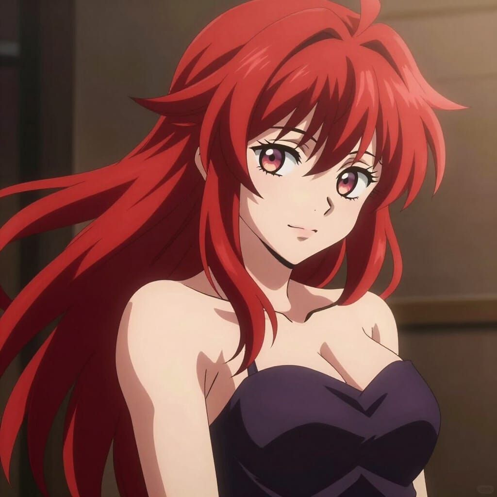 This image features a captivating female anime character with striking red hair and large eyes, depicted in the detailed style of Jujutsu Kaisen anime key visuals. Soft, dramatic lighting enhances her alluring features.