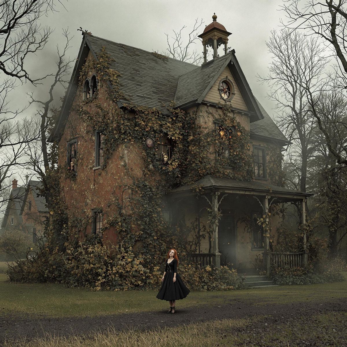 This image captures a foreboding scene of an abandoned house threatened by dark, obscure folk rituals. A girl's presence adds an eerie, ornamental touch to its impending razing.