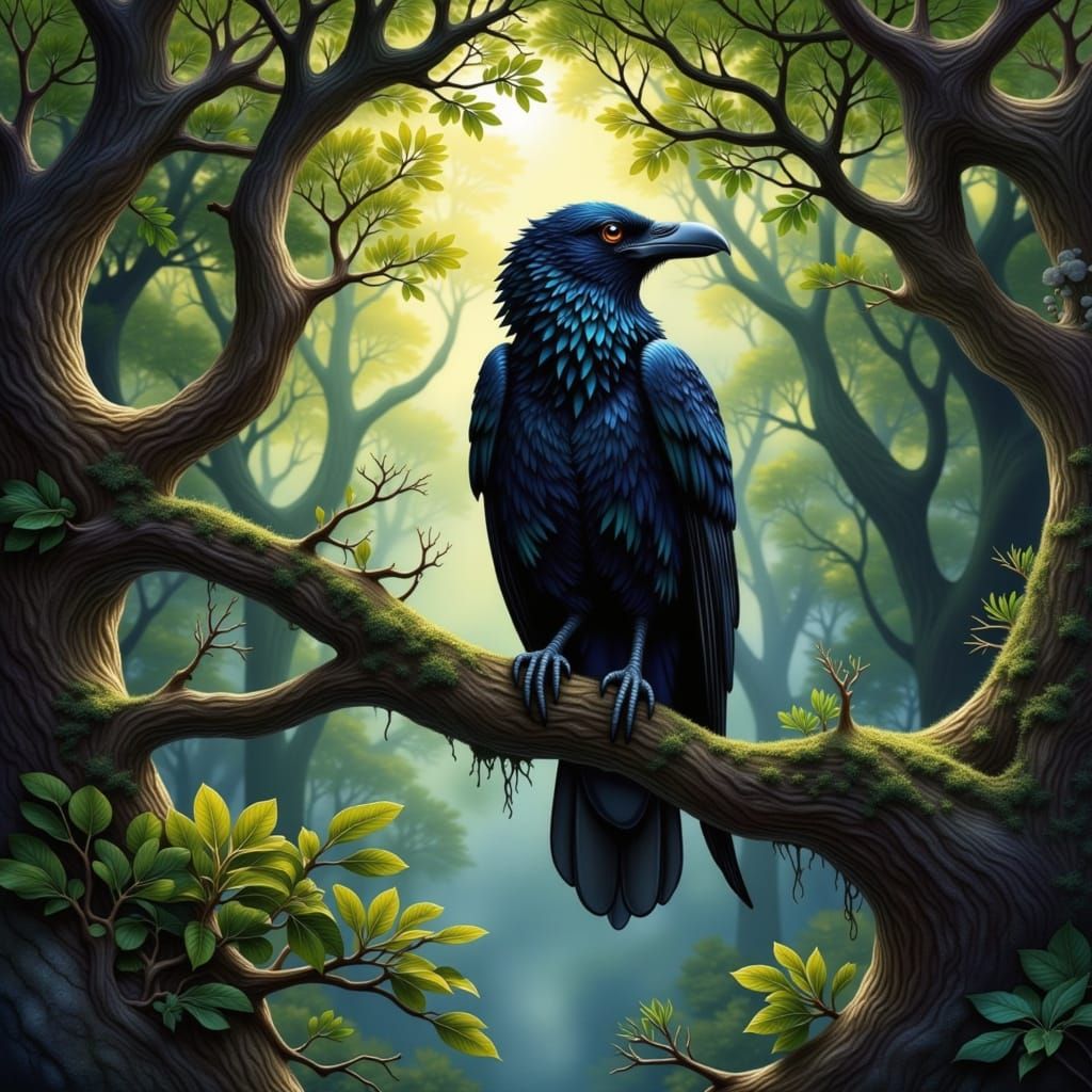 A majestic raven rests on a mossy branch in an ancient, mystical wood. Ethereal mist and dappled light highlight its feathers, creating a dark fantasy atmosphere with rich colors and dramatic lighting.