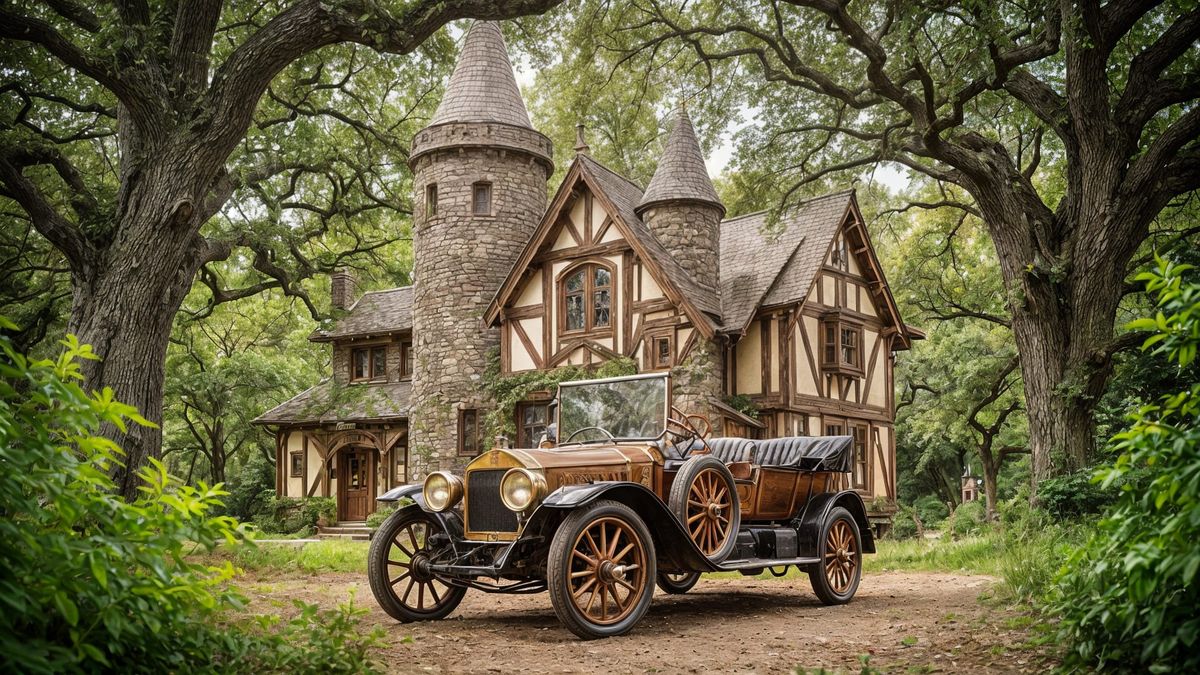 A striking vintage 1905 automobile is parked before a charming, rustic elven cottage nestled in a forest. Captured with professional photography techniques, featuring natural light and sharp focus.