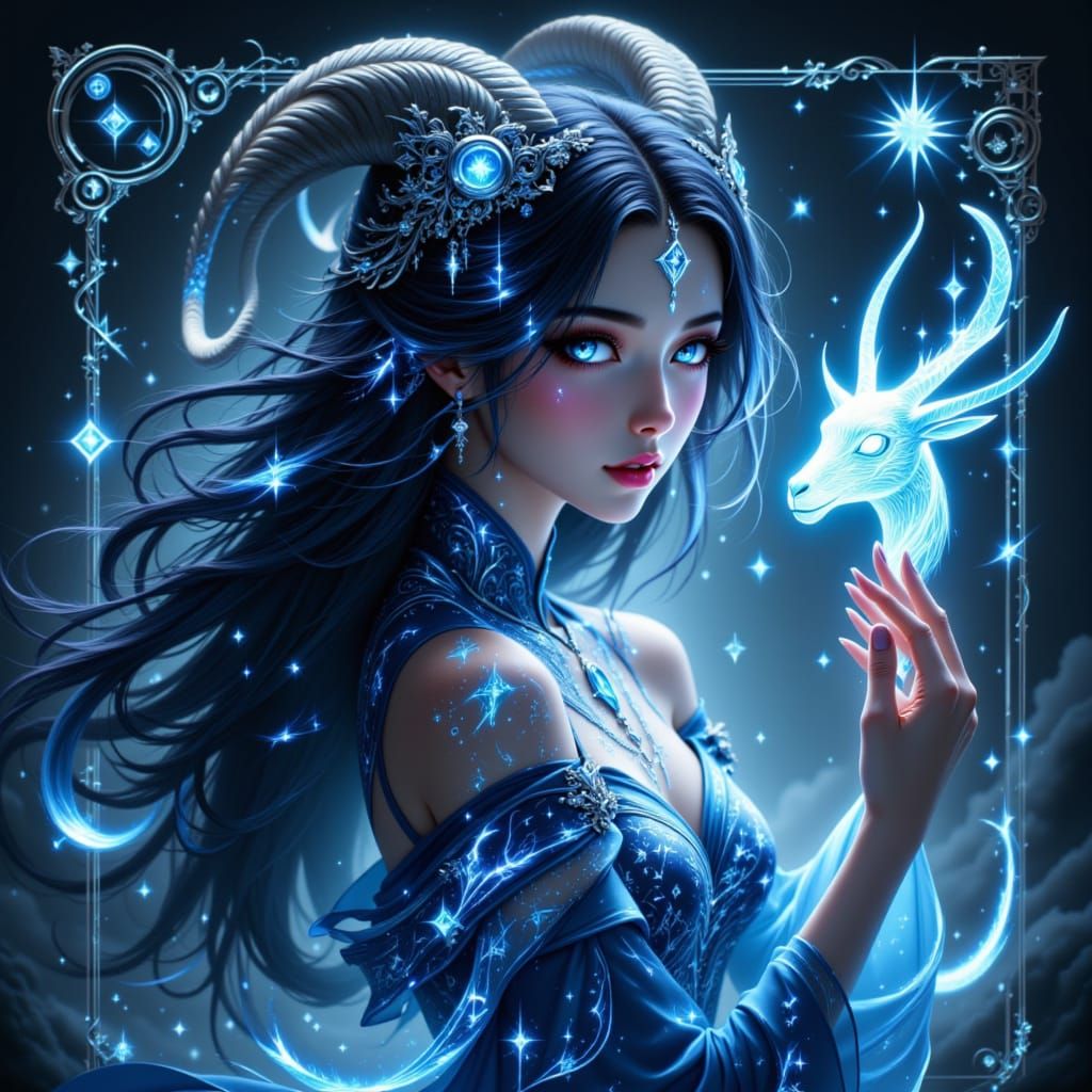 This image shows a stunning 3D anime-style character card featuring a beautiful Asian woman. She is adorned with intricate jewelry and a dress inspired by the goat zodiac. A holographic goat symbol glows beside her.