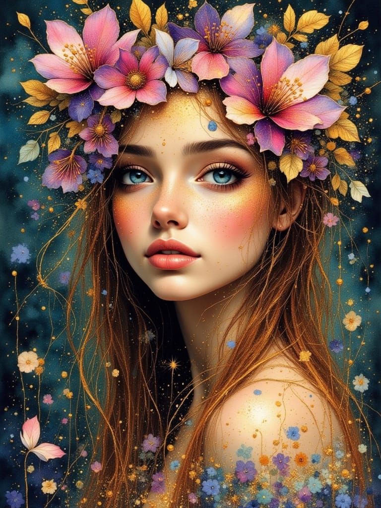 This image shows a radiant woman with sapphire eyes and flower-woven hair in a magical garden. The colors are surreal, the lighting ethereal, and the aesthetic is reminiscent of vibrant watercolor art.